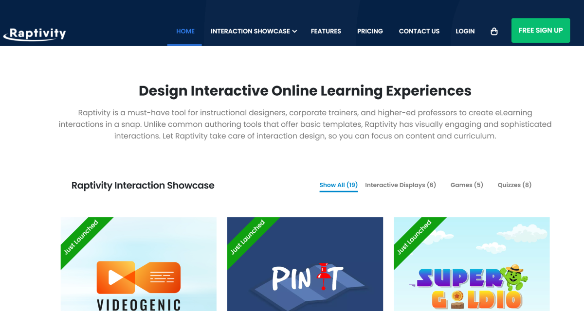 Raptivity is an easy-to-use tool for creating interactive learning components that enhance engagement and retention. It provides a wide collection of ready-made templates for games, timelines, flashcards, and scenarios that can be customized without any coding. Designed to complement other authoring tools, Raptivity integrates smoothly with platforms like Storyline, Captivate, and Lectora.